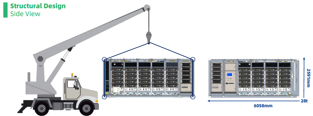 Flexibel toepasbaar: Dankzij het geïntegreerde systeem (batterij + omvormer + EMS + koeling) kan de unit direct gekoppeld worden aan bestaande infrastructuur of nieuwbouwprojecten zonder dat elk onderdeel afzonderlijk moet worden samengesteld.