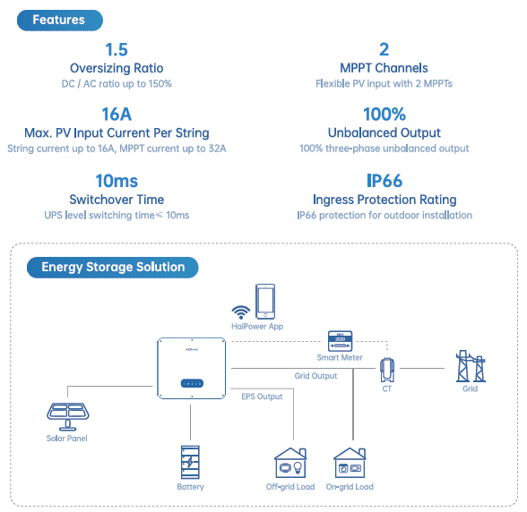 Ideal for larger installations in grid-constrained areas: Many inverters in this class are either focused on grid injection or require expensive storage expansions. The AH-10KTH-G1 combines both in a single enclosure, making it particularly suitable for larger homes, small and medium-sized businesses, farms, or energy cooperatives.