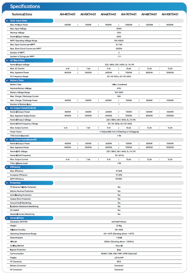 The AOHAI AH-10KTH-G1 is a powerful and future-proof 10 kW three-phase hybrid inverter, specifically designed for larger residential installations, small businesses, and agricultural applications. Thanks to smart storage options, fast backup functionality, and high efficiency, this system is a solid choice in a rapidly changing energy market.