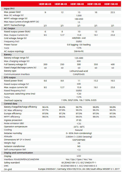 De HERF-12K-H3 is een driefasige hybride omvormer (3-fase) uit de HERF H3-serie van Estar. Deze serie is ontwikkeld om zonne-energie (PV) en batterijopslag (ESS) te integreren in één systeem. Uit de datasheets blijkt dat bijvoorbeeld de combinaties “HERF-10K-H3 / 15 kWh” worden vermeld, wat aangeeft dat deze omvormer gekoppeld kan zijn aan opslagsystemen van circa 15 kWh.
