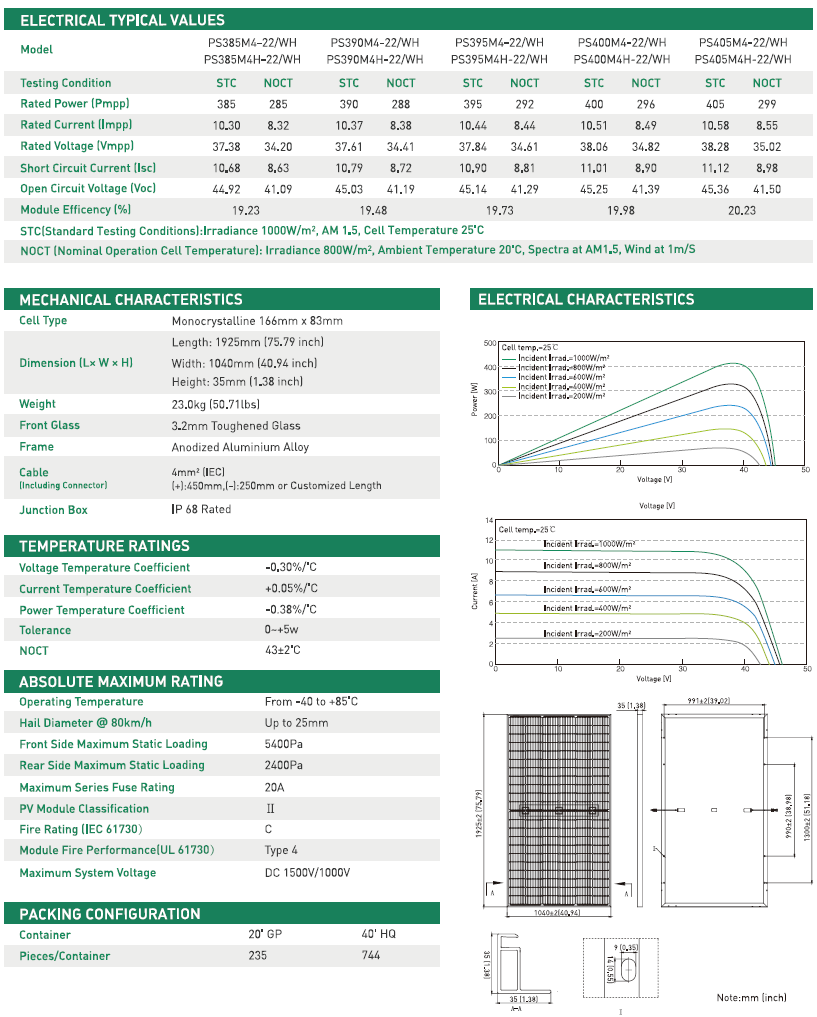Het PS400M6-18/VH zonnepaneel is een krachtig monokristallijn zonnepaneel ontworpen voor zowel residentiële als commerciële zonne-energiesystemen. Het biedt een uitstekende balans tussen prijs, prestaties en lange levensduur. Hier is een gedetailleerde beschrijving van de kenmerken, afmetingen, en garantie van dit paneel: