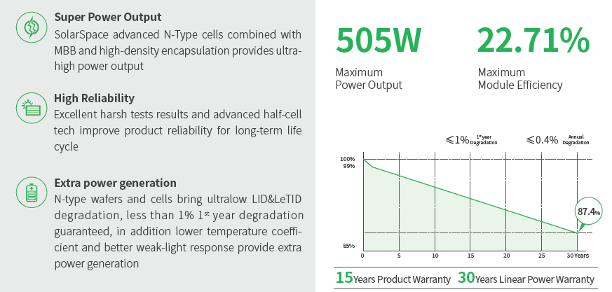 De Solar Space 500Wp SSA-54HDB is een hoogwaardig all-black zonnepaneel ontworpen voor maximale prestaties en een strak esthetisch uiterlijk. Dankzij geavanceerde anti-reflectiecoating (ARC) leveren deze panelen meer energie, zelfs bij minder ideale lichtomstandigheden zoals bewolking of lage instraling.