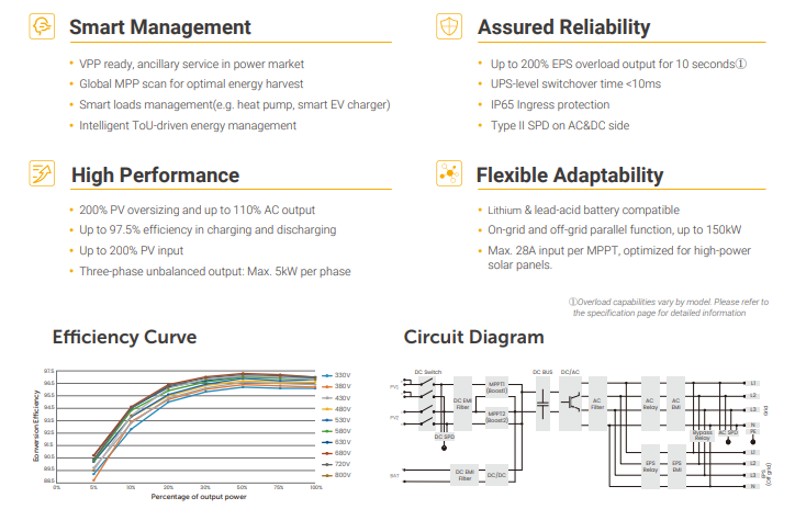 Oversizing & overbelasting: Dankzij ondersteuning tot 200 % PV-oversizing en 110 % AC-overbelasting kan het systeem meer PV-capaciteit gebruiken dan nominale AC-capaciteit en korte pieken opvangen.
